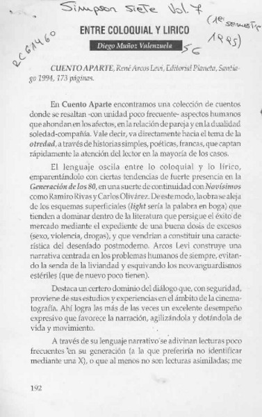 Entre coloquial y lírico [artículo] Diego Muñoz Valenzuela.
