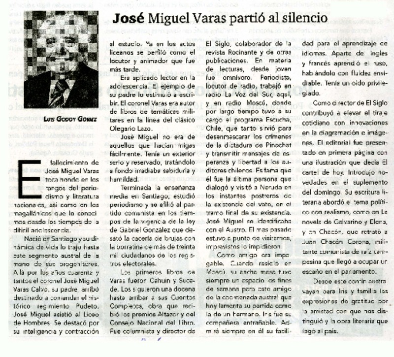 José Miguel Varas partió al silencio [artículo] Luis Godoy Gómez.