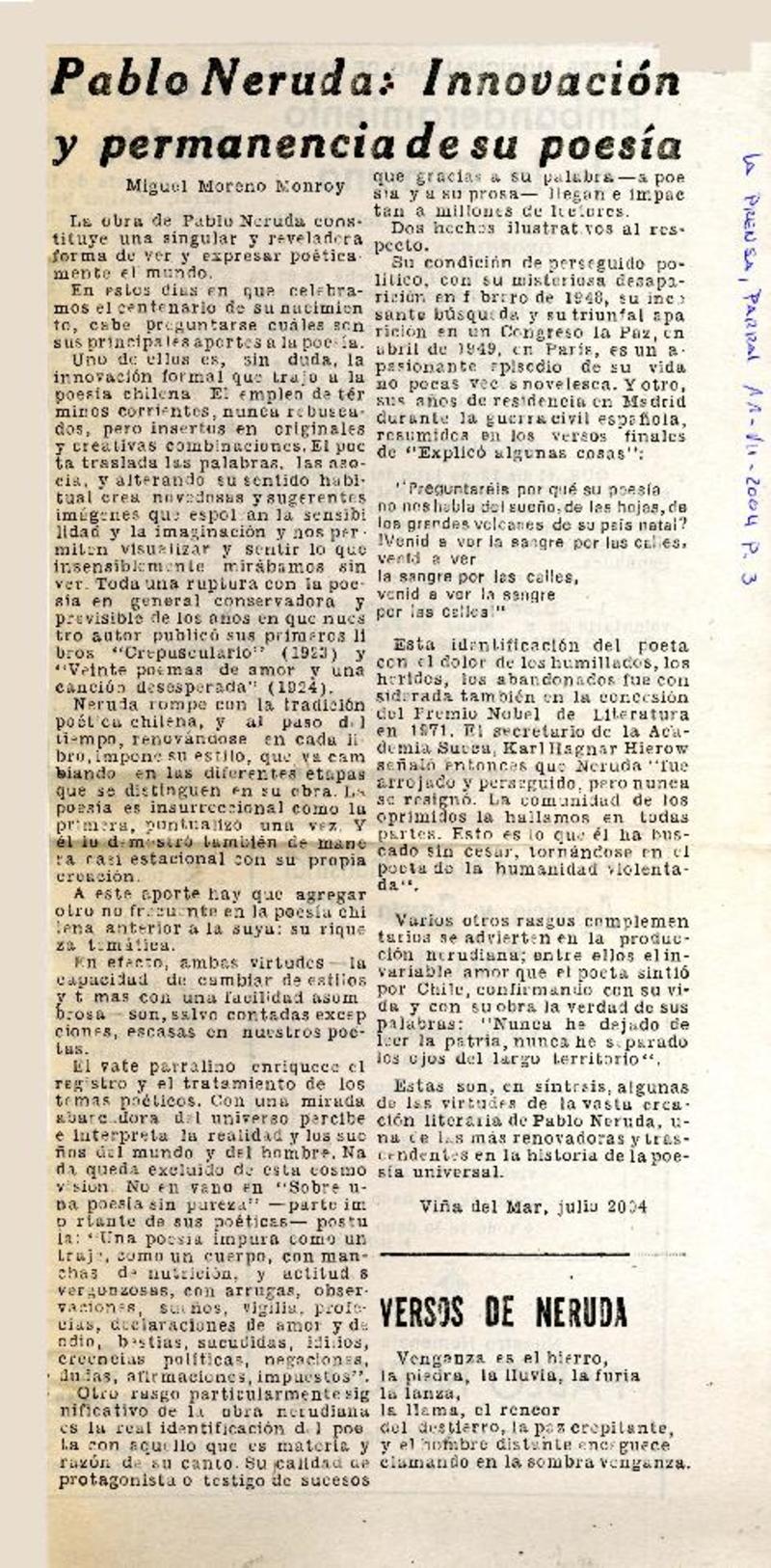 Pablo Neruda : Innovación y permanencia de su poesía [artículo] Miguel Moreno Monroy.
