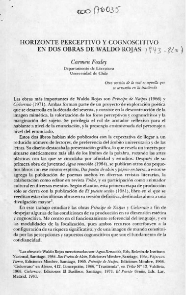 Horizonte perceptivo y cognoscitivo en dos obras de Waldo Rojas [artículo] Carmen Foxley.