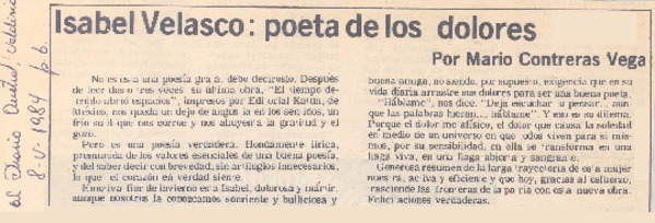 Isabel Velasco: poeta de los dolores [artículo] Mario Contreras Vega.