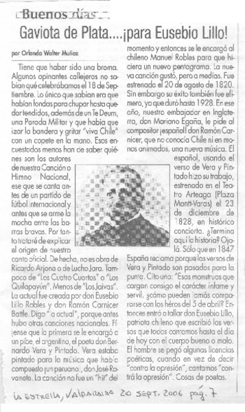 Gaviota de plata -- para Eusebio Lillo! [artículo] por Orlando Walter Muñoz.