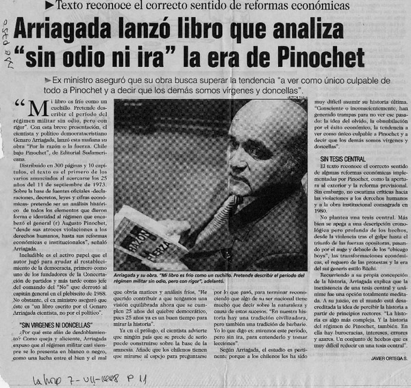 Arriagada lanzó libro que analiza "sin odio ni ira" la era de Pinochet [artículo] Javier Ortega S.