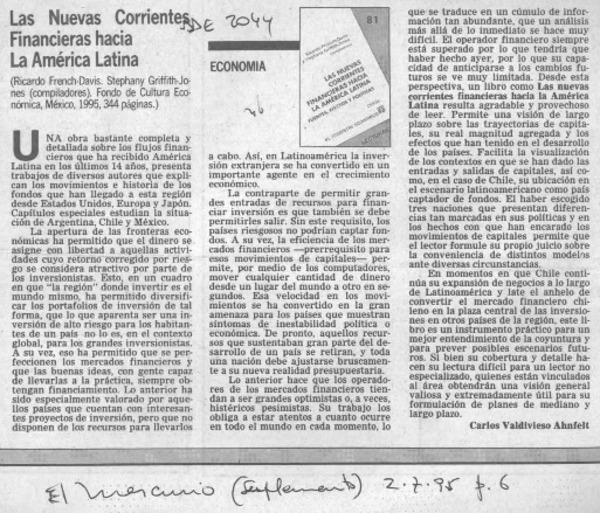 Las nuevas corrientes financieras hacia la América Latina [artículo] Carlos Valdivieso Ahnfelt.