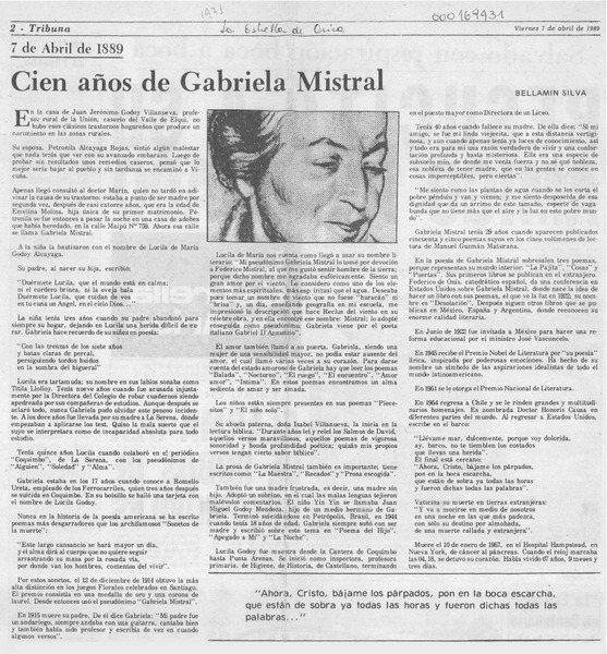 Cien años de Gabriela Mistral [artículo] Bellamín Silva.