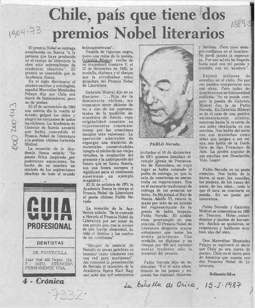 Chile, país que tiene dos premios Nobel literarios [artículo] Bellamín Silva.