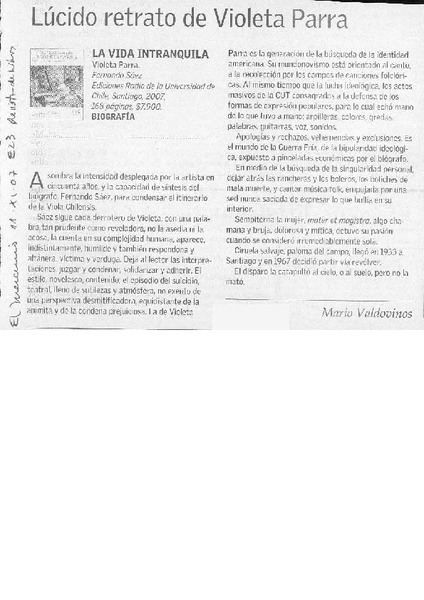 Lúcido retrato de Violeta Parra [artículo] Mario Valdovinos.