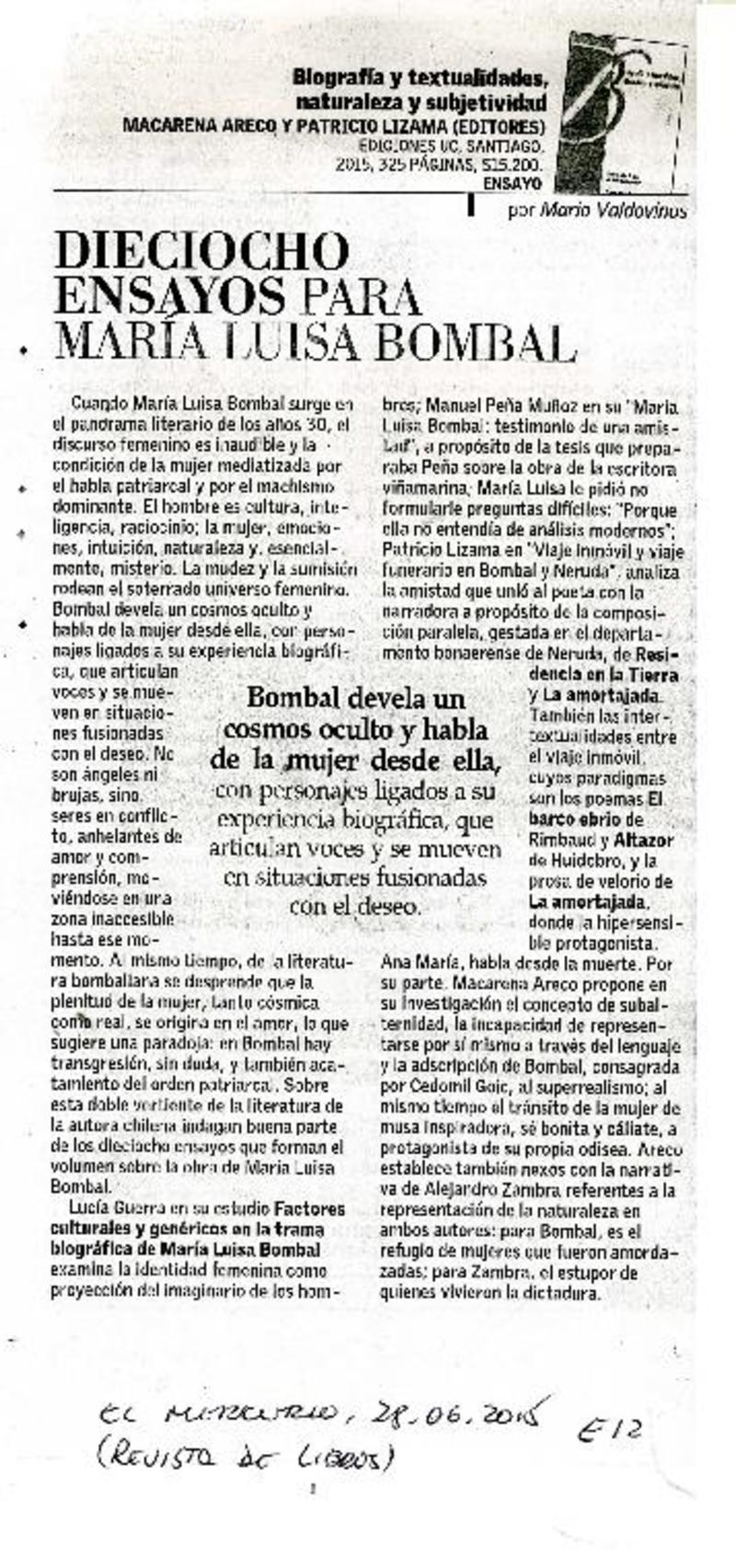 Dieciocho ensayos para María Luisa Bombal [artículo] Mario Valdovinos.