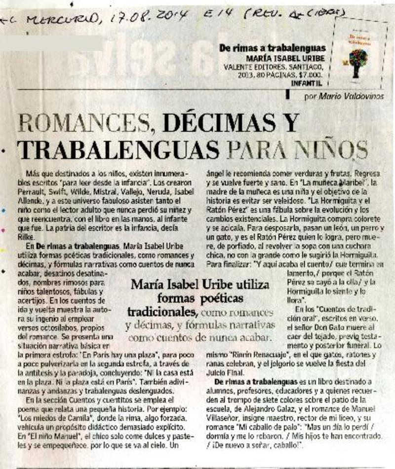 Romances, décimas y trabalenguas para niños [artículo] Mario Valdovinos.