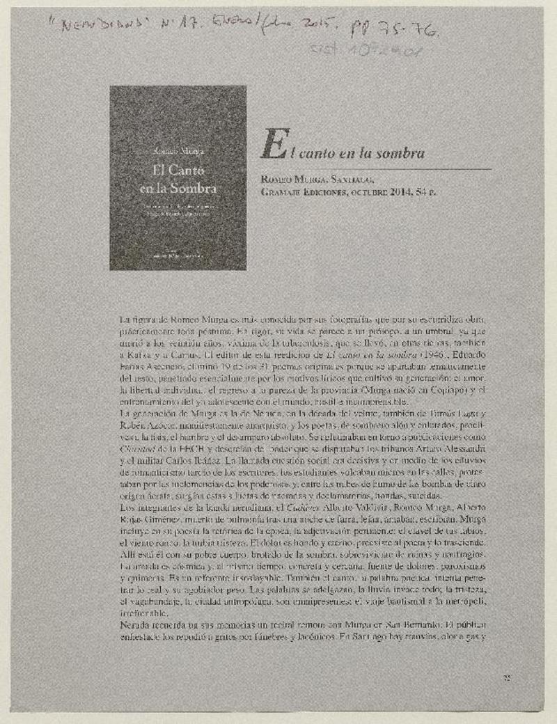 Autores chilenos - Murga, Romeo - El canto en la sombra