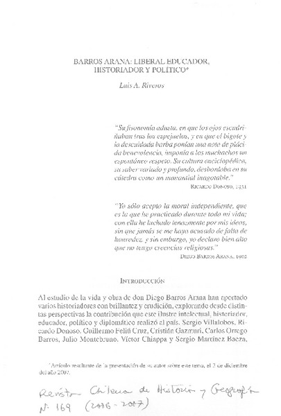 Barros Arana: liberal educador, historiador y político [artículo] Luis A. Riveros.