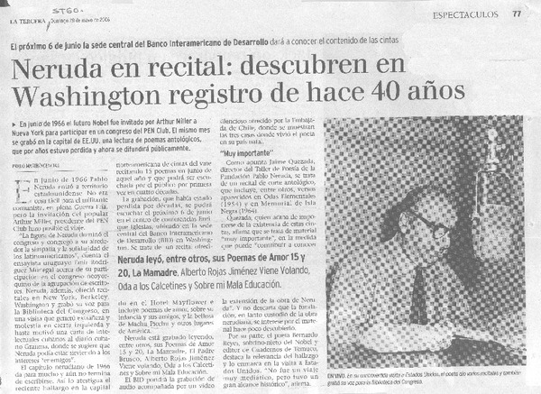 Neruda en recital: descubren en Washington registro de hace 40 años [artículo] Pablo Marín.