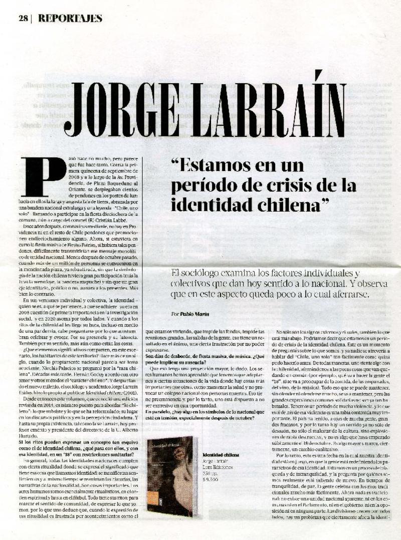 Jorge Larraín "Estamos en un período de crisis de la identidad chilena" [artículo] Pablo Maín.