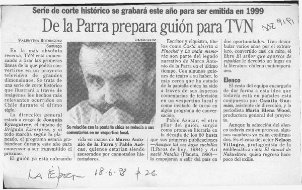 De la Parra prepara guión para TVN [artículo] Valentina Rodríguez.