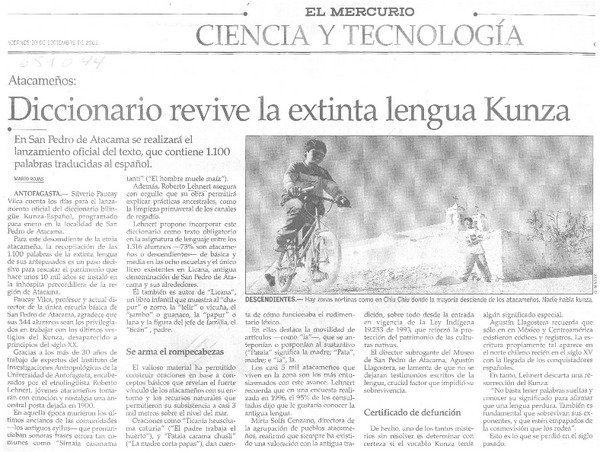 Diccionario revive la extinta lengua Kunza [artículo] Mario Rojas