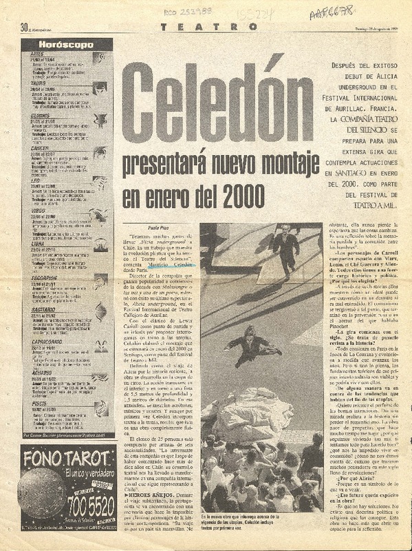 Celedón presentará nuevo montaje en enero del 2000 [artículo] Paola Pino.