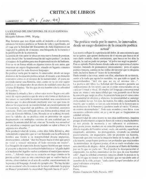 La soledad del encuentro, de Julio Espinosa [artículo] Isabel Gómez.