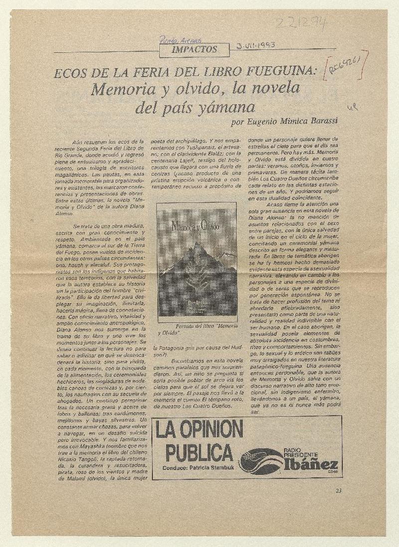 Ecos de la Feria del Libro Fueguina, "Memoria y olvido", la novela del país yámana [artículo] Eugenio Mimica Barassi.