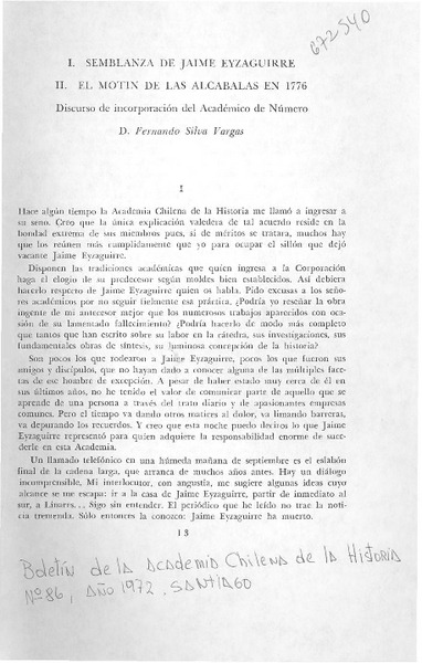 Semblanzas de Jaime Eyzaguirre. II. El motín de las alcabalas en 1776 [artículo] Fernando Silva Vargas.