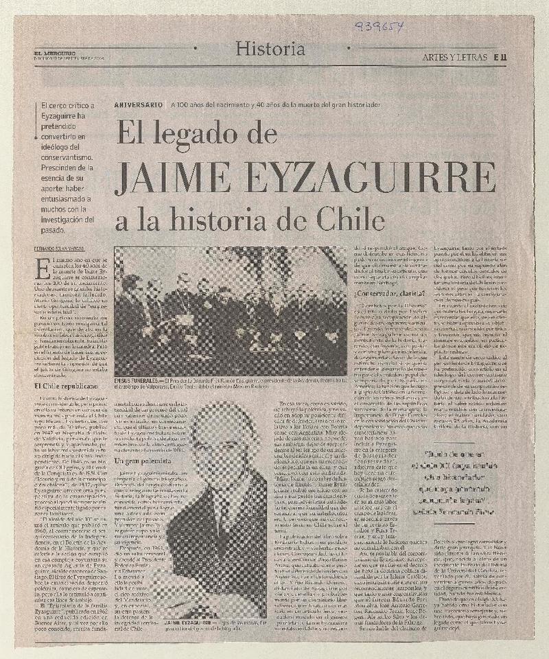El legado de Jaime Eyzaguirre a la historia de Chile [artículo] Fernando Silva Vargas.