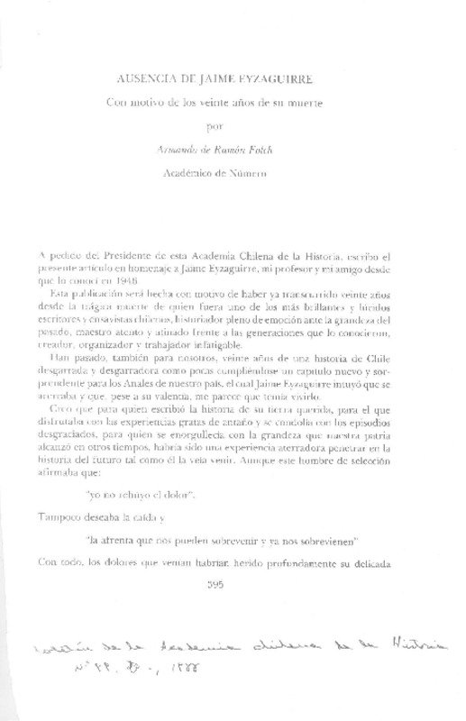 Ausencia de Jaime Eyzaguirre [artículo] Armando de Ramón Folch.