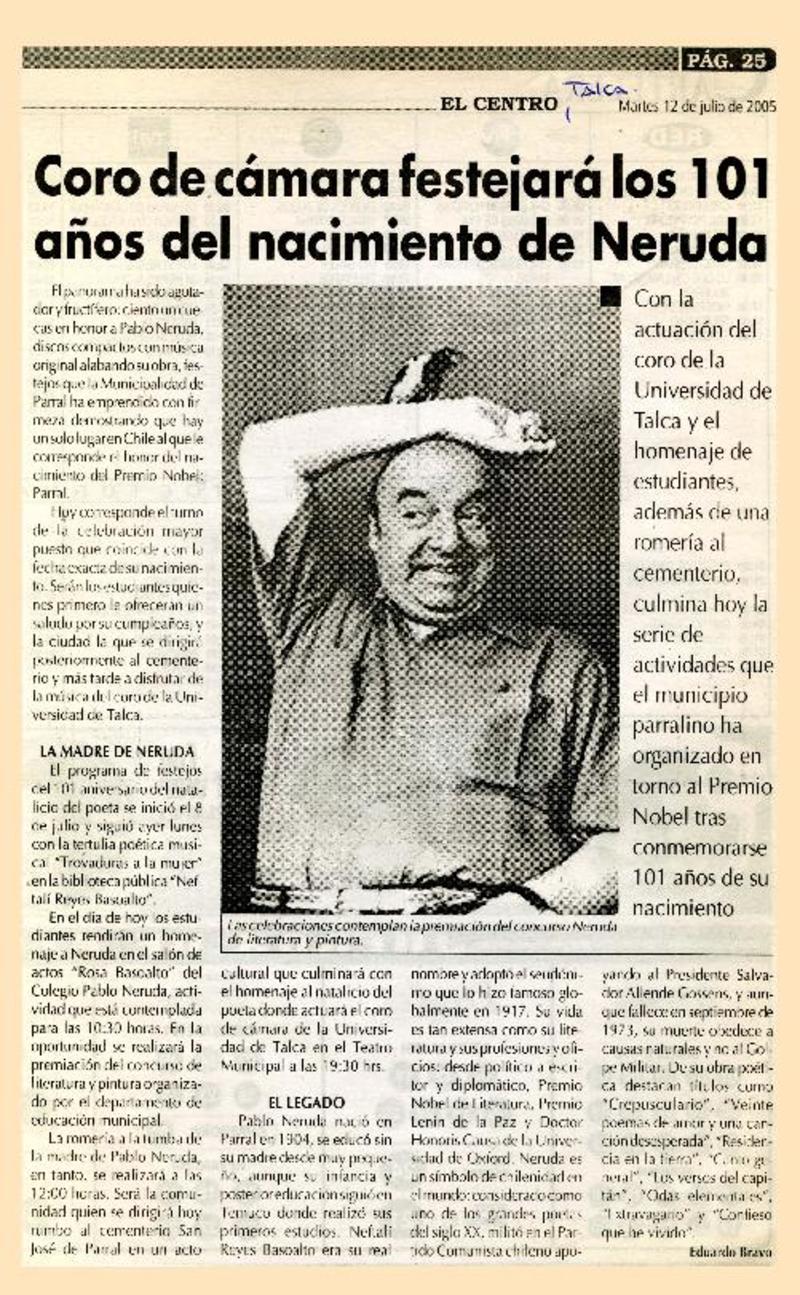 Coro de cámara festejará los 101 años del nacimiento de Neruda [artículo] Eduardo Bravo.