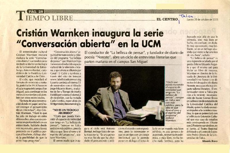 Cristián Warnken inaugura la serie "Conversacion abierta" en la UCM [artículo]Eduardo Bravo.