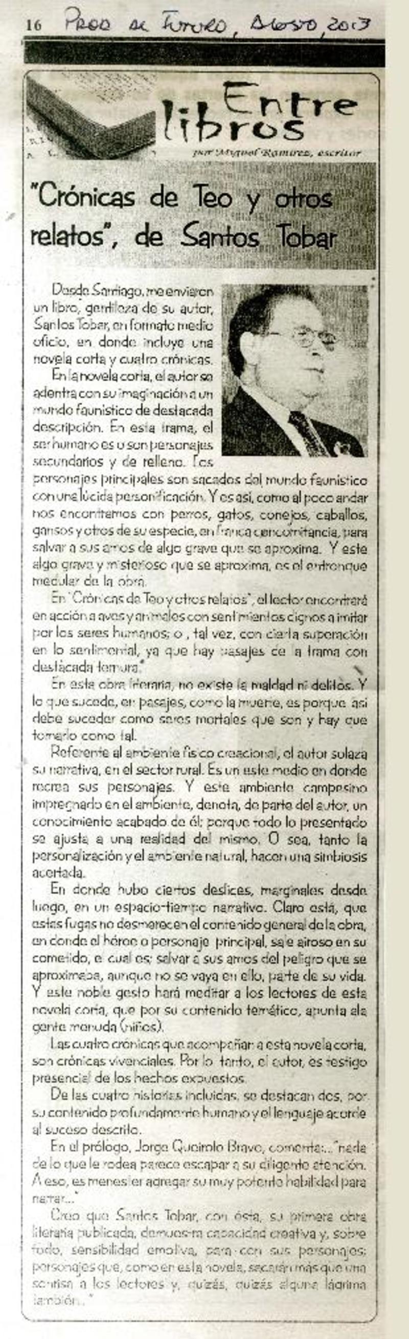 "Crónicas de Teo y otros relatos", de Santos Tobar [artículo] Miguel Ramírez.