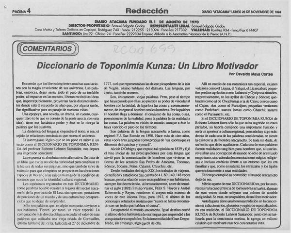 Diccionario de toponimia kunza, un libro motivador [artículo] Osvaldo Maya Cortés.