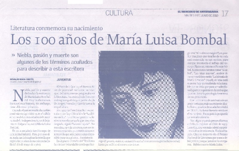 Los 100 años de María Luisa Bombal [artículo] Osvaldo Maya Cortés.