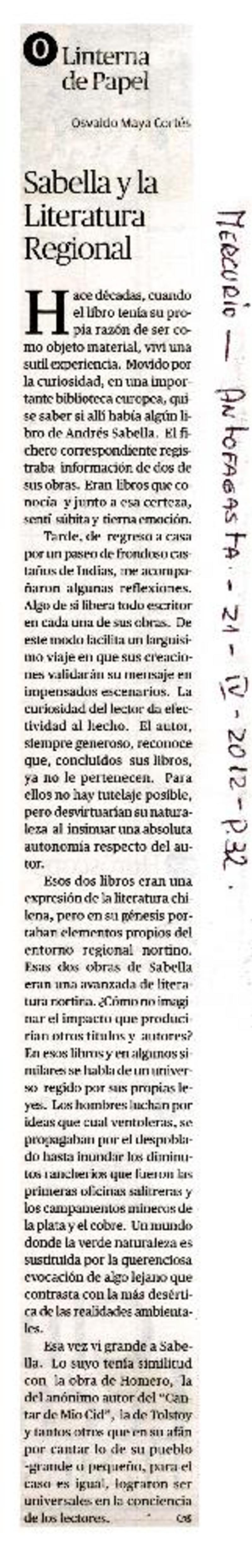 Sabella y la literatura regional [artículo] Osvaldo Maya Cortés.
