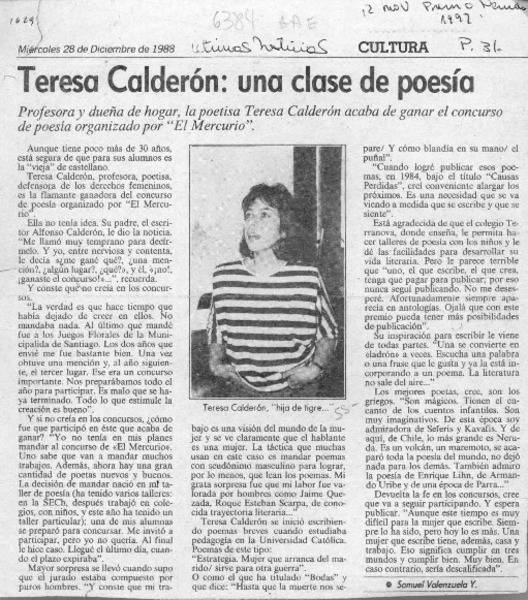 Teresa Calderón, una clase de poesía [artículo] Samuel Valenzuela Y.