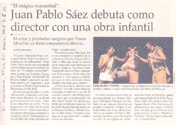 El mágico manantial : Juan Pablo Sáez debuta como director con una obra infantil [artículo] Verónica Marinao.