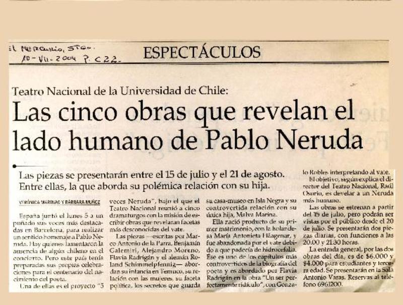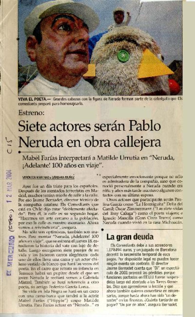 Siete actores serán Pablo Neruda en obra callejera [artículo] Verónica Marinao <y> Bárbara Muñoz.