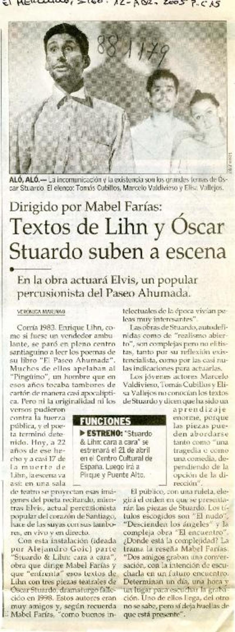 Textos de Lihn y Oscar Stuardo suben a escena [artículo] Verónica Marinao.