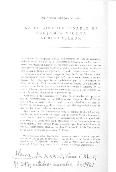 En el cincuentenario de Benjamín Vicuña Subercaseaux [artículo] Francisco Orrego Vicuña.