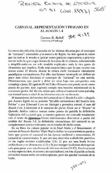 Carnaval, representación y fracaso en El Buscón [artículo] Carmen R. Rabell.