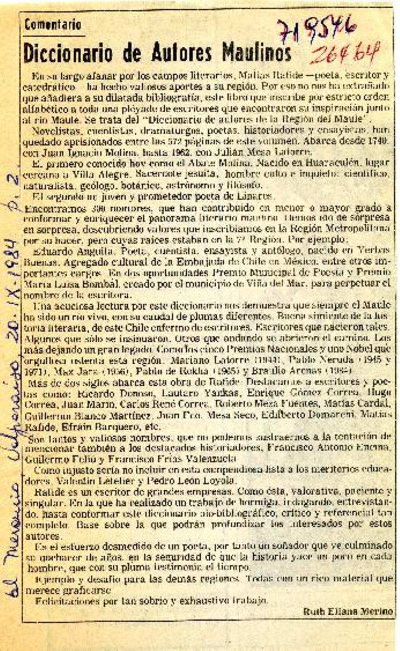 Diccionario de autores maulinos [artículo] Ruth Eliana Merino.
