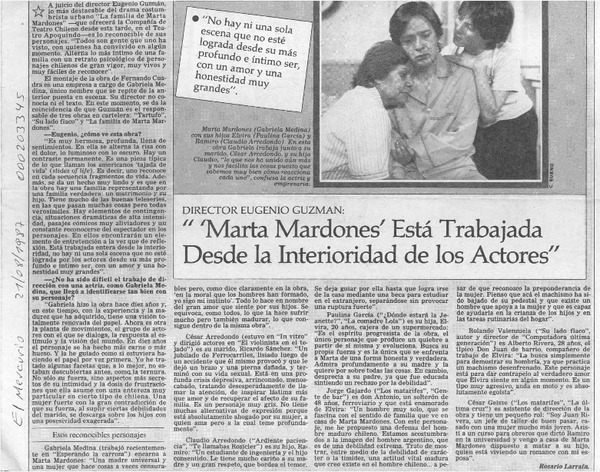 Director Eugenio Guzmán, "Marta Mardones" está trabajada desde la interiodad de los actores [artículo] Rosario Larraín.