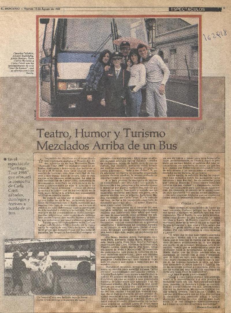 Teatro, humor y turismo mezclados arriba de un bus [artículo] Rosario Larraín M.