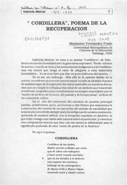 "Cordillera", poema de la recuperación [artículo] Maximino Fernández Fraile.
