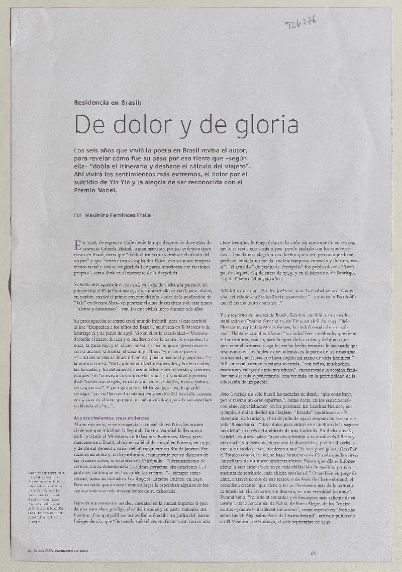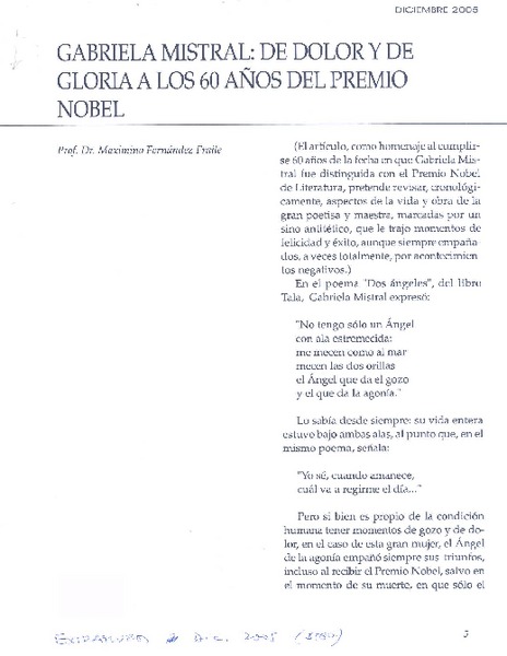 Gabriela Mistral: de dolor y de gloria a los 60 años del Premo Nobel [artículo] Maximino Fernández Fraile