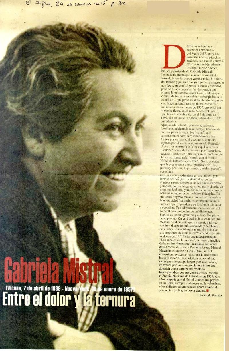 Gabriela Mistral entre el dolor y la ternura [artículo] Fernando Barraza.