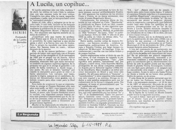 A Lucila, un copihue -- [artículo] Fernando de la Lastra Bernales.