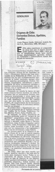 Orígenes de Chile, elementos étnicos, apellidos, familias [artículo] Fernando de la Lastra.