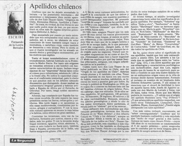 Apellidos chilenos [artículo] Fernando de la Lastra Bernales.
