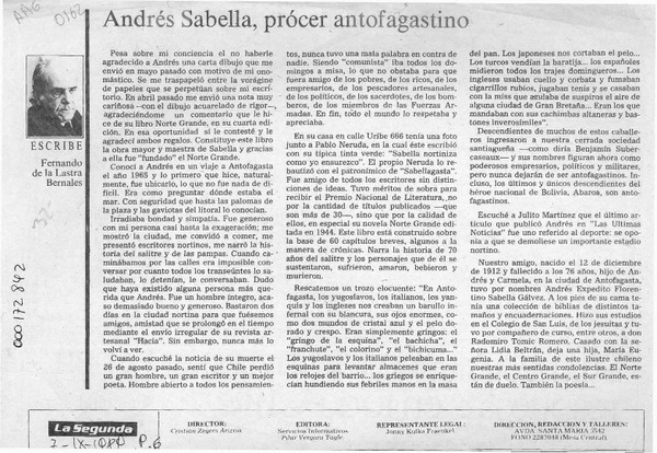 Andrés Sabella, prócer antofagastino [artículo] Fernando de la Lastra Bernales.
