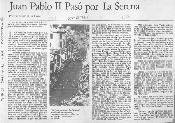 Juan Pablo II pasó por La Serena [artículo] Fernando de la Lastra.