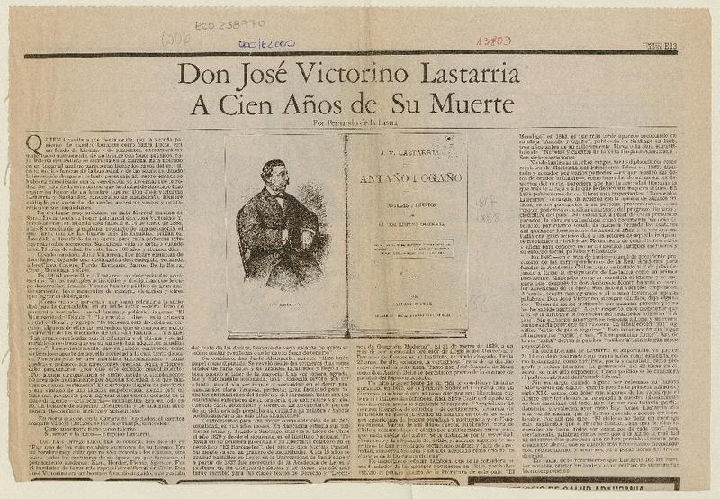 Don José Victorino Lastarria a cien años de su muerte [artículo] Fernando de la Lastra.