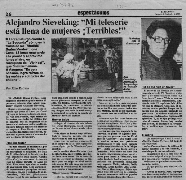 Alejandro Sieveking, "Mi teleserie está llena de mujeres terribles!" [artículo] Pilar Entrala.